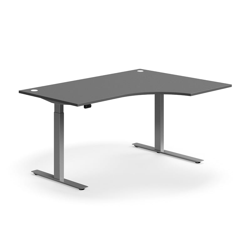 Stødig hjørneskrivebord med hev- og senk funksjon og T-stativ. Stativet er utstyrt med to elmotorer og antikollisjon. Det elektriske skrivebordet har justerbare ben og en slitesterk, buet bordplate med kabelhull.