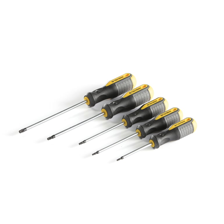 Skrutrekkersett med skrutrekkere i fem ulike størrelser: T10x75 mm, T15x100 mm, T20x100 mm, T25x125 mm, T30x150 mm. Skrutrekkerne har sortoksiderte spisser for en høy presisjon.